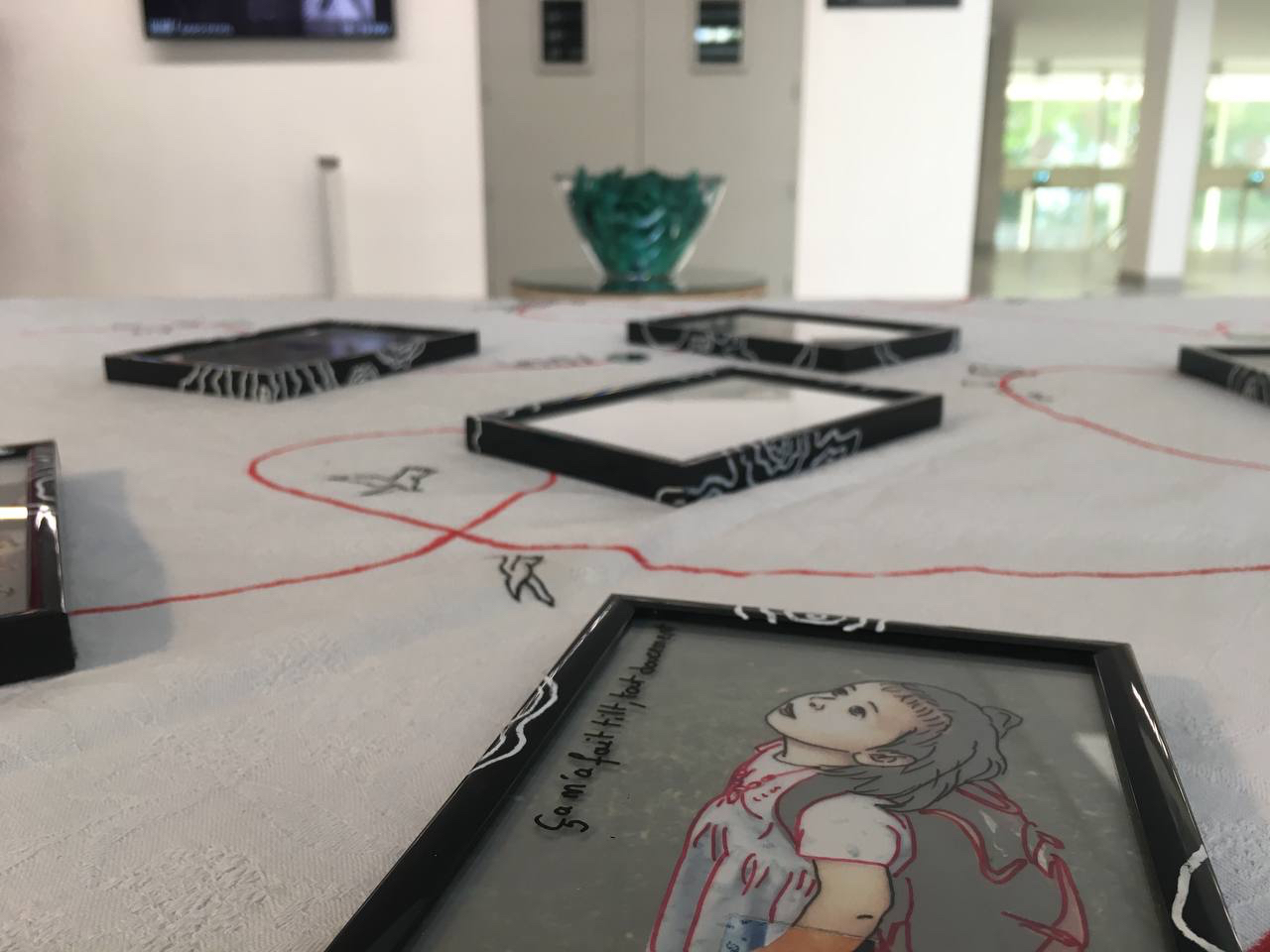 Dans l’optique d’investir les espaces d’accueil du public des lieux dans lesquels nous jouons, le Théâtre au Corps a demandé à Clara Ruestchmann de concevoir une œuvre qui tourne avec le spectacle. À côté de tables destinées à accueillir un buffet, proposé au public à la fin de la représentation, le public pourra découvrir son travail, comme un espace de résonances.