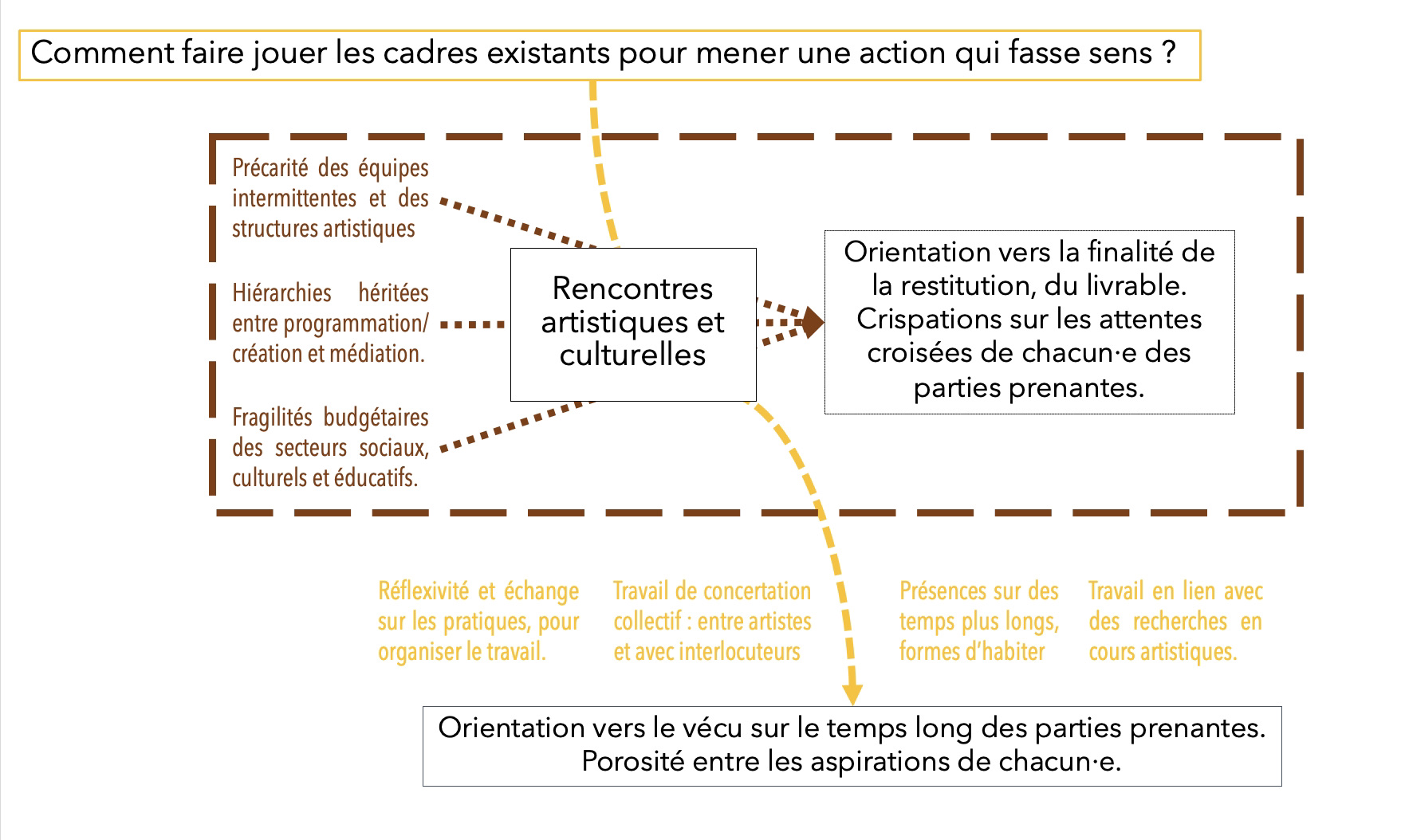 Pour mieux appréhender dans de bonnes conditions les rencontres artistiques et culturelles dans lesquelles nous nous inscrivons, nous avons ainsi été à l'organisation de temps de réflexion dédiés, réunissant artistes, enseignant·es et opérateur·trices culturel·les. Le schéma ici reprend les éléments saillants de ces échanges, mais l'enjeu pour nous est bien de continuer à alimenter ces réflexions au gré de nos pratiques : nous sommes en cela largement suivi·es et appuyé·es par nos tutelles, et en particulier par la DRAC Nouvelle Aquitaine.